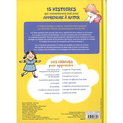 15 histoires ludiques et légères, toutes finement expliquées par Geneviève Djenati, psychothérapeute de la famille. Les idées géniales sont souvent nées de la capacité de leurs auteurs à se tromper et à ne pas s'arrêter à la frustration. L'erreur commise peut être transformée en expérience positive. Parents, grands-parents, éducateurs avons tendance à vouloir protéger les enfants des écueils qu'ils peuvent rencontrer, mais que seraient le courage et l'estime de soi sans ces obstacles qu'il faut surmonter ?