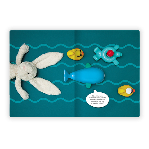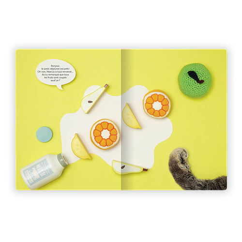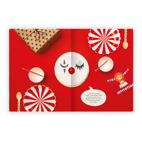 Le petit-déjeuner, les jeux, le déjeuner, la sieste, le goûter d’anniversaire avant et après, le bain, le dîner et le coucher: neuf moments-clés de la vie évoqués dans des mises en scène d'objets sur des fonds colorés.