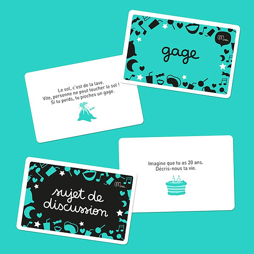 Chacun leur tour, les participants piochent une carte « sujet de discussion ». Routine du quotidien, débats philosophiques, sujets incongrus… tout y passe ! Si le sujet n’inspire pas, on pioche un « gage » . Et là plus moyen de se débiner…